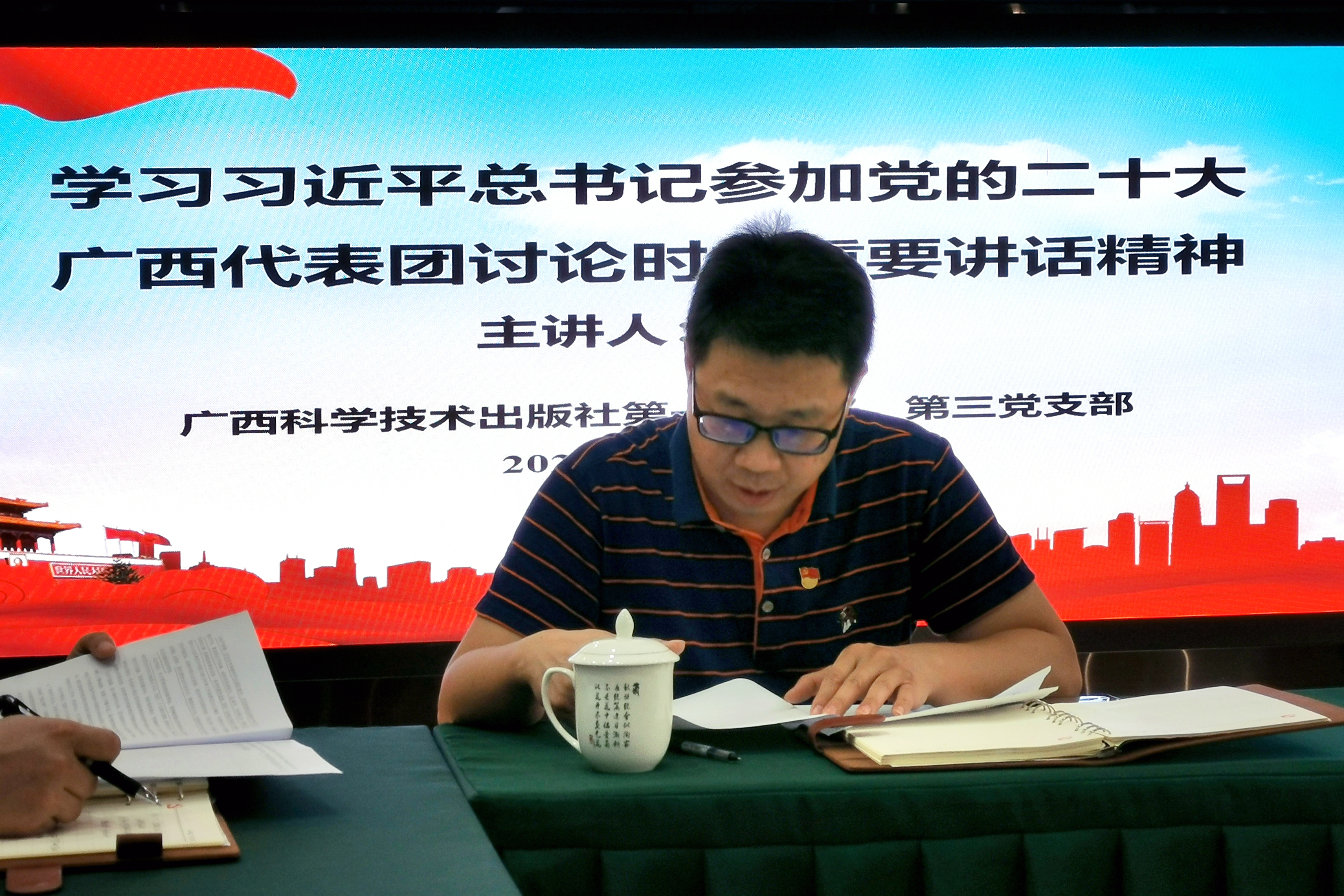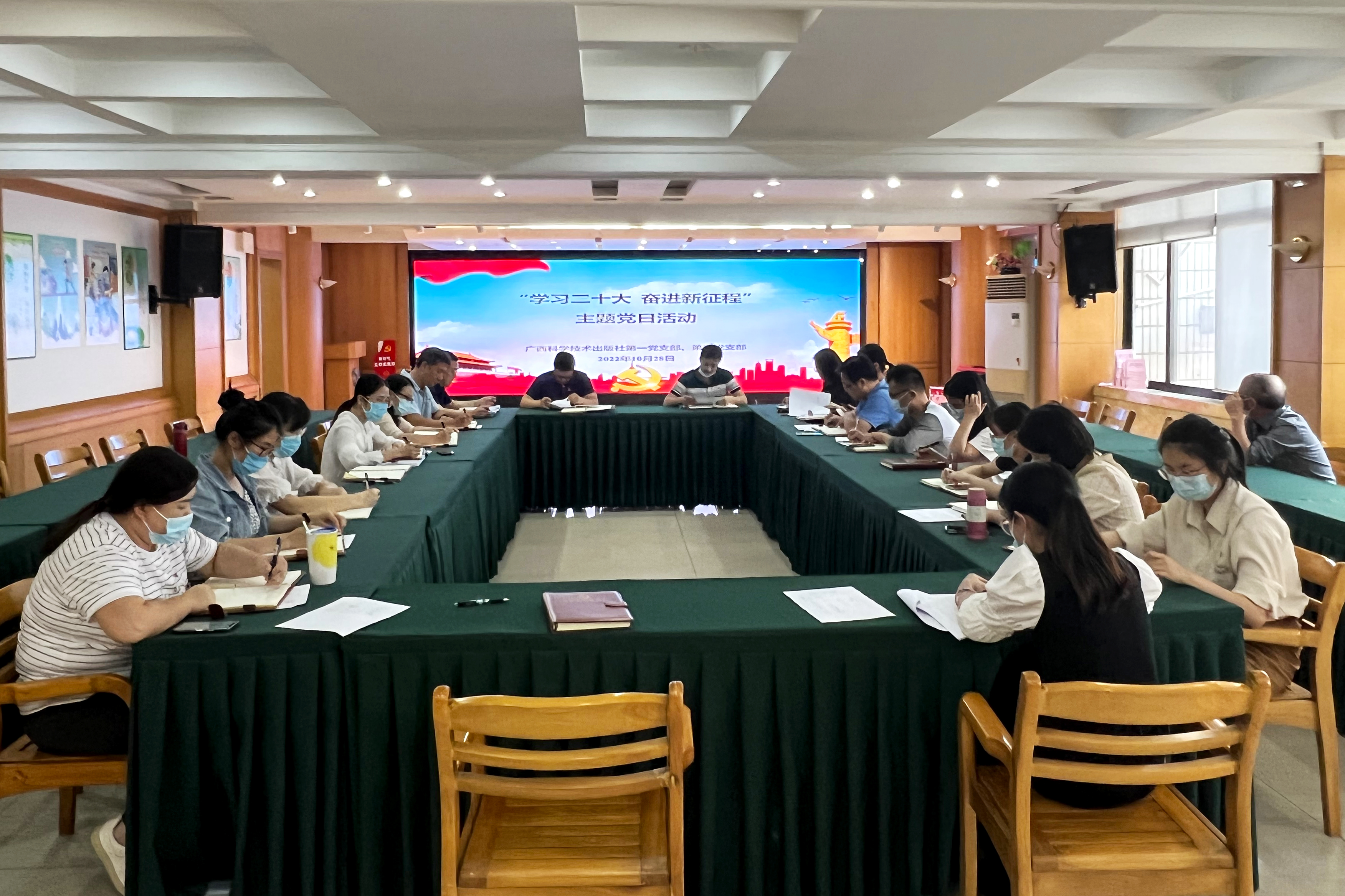 为深入学习贯彻党的二十大精神,学习习近平总书记参加广西代表团讨论时的重要讲话精神,2022年10月28日,广西科学技术出版社第一、第三党支部联合组织开展“学习二十大 奋进新征程”主题党日活动。活动由第三党支部负责人黎志海主持,第一、第三党支部全体党员参加会议。
