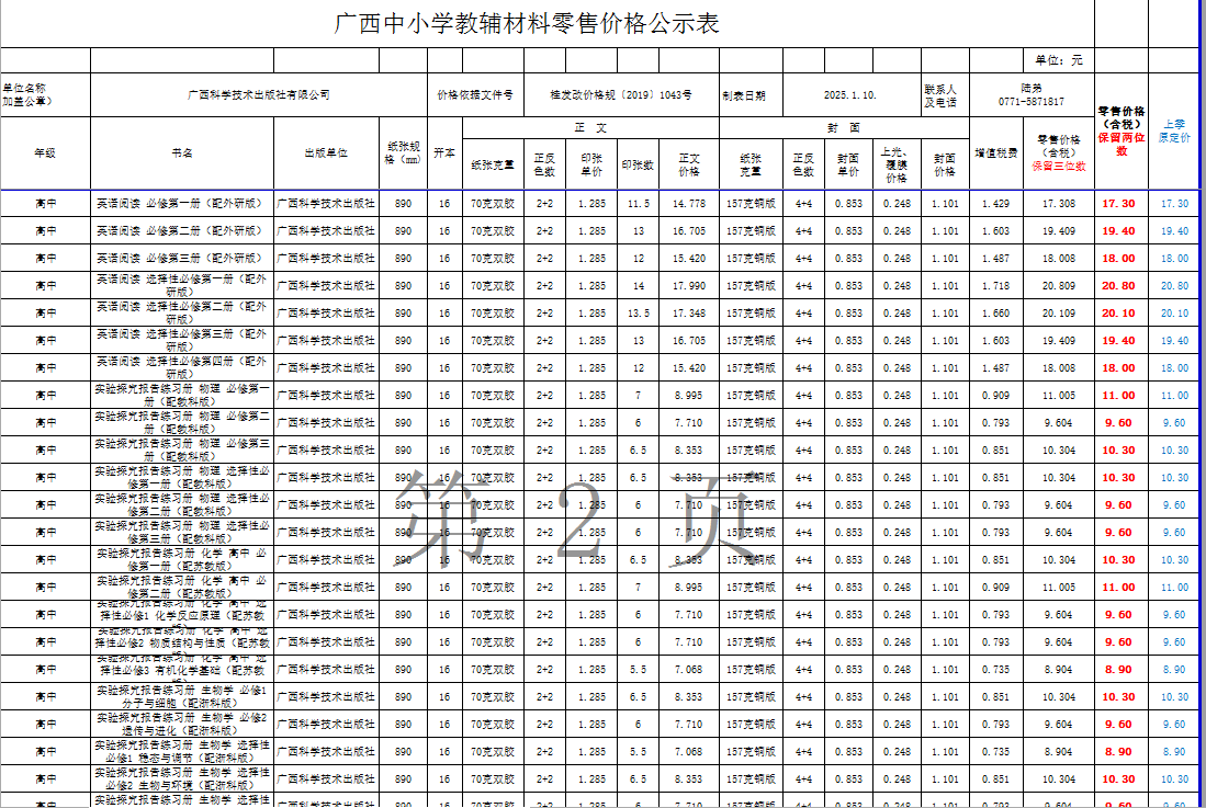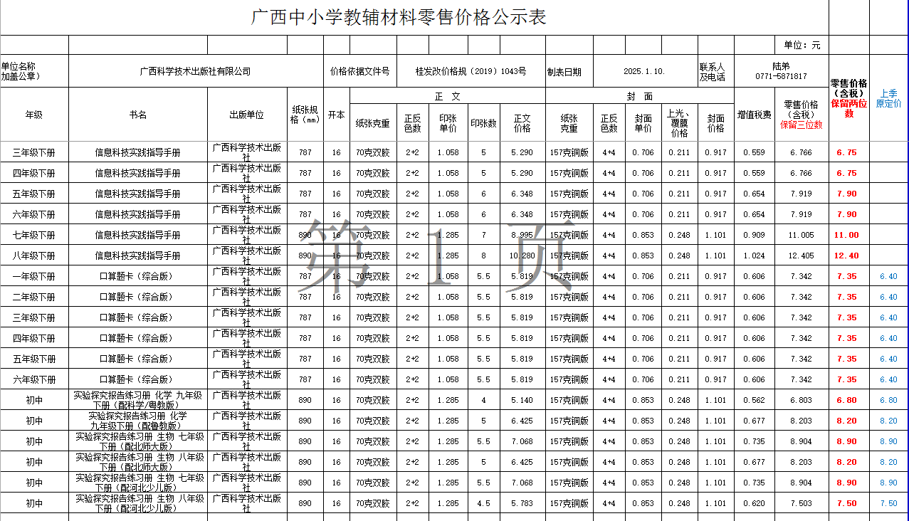 广西科技社-2025年春季广西中小学教辅材料零售价格公示表